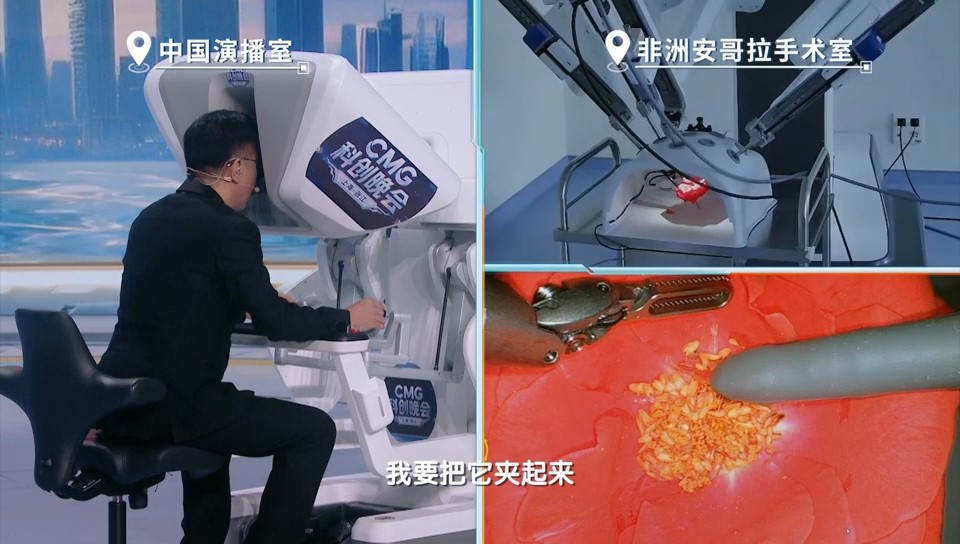 节目现场,央视著名主持人张腾岳从北京实时操控图迈®手术机器人,成功“跨越”约12000公里,摘取远在安哥拉罗安达一朵鲜花的花粉。这一“跨洲操作”精细流畅、动作稳健、毫无延迟,生动展示了图迈®机器人在超远距离信号传输、实时控制响应与毫米级精度操作方面的卓越性能,令现场观众惊叹不已。