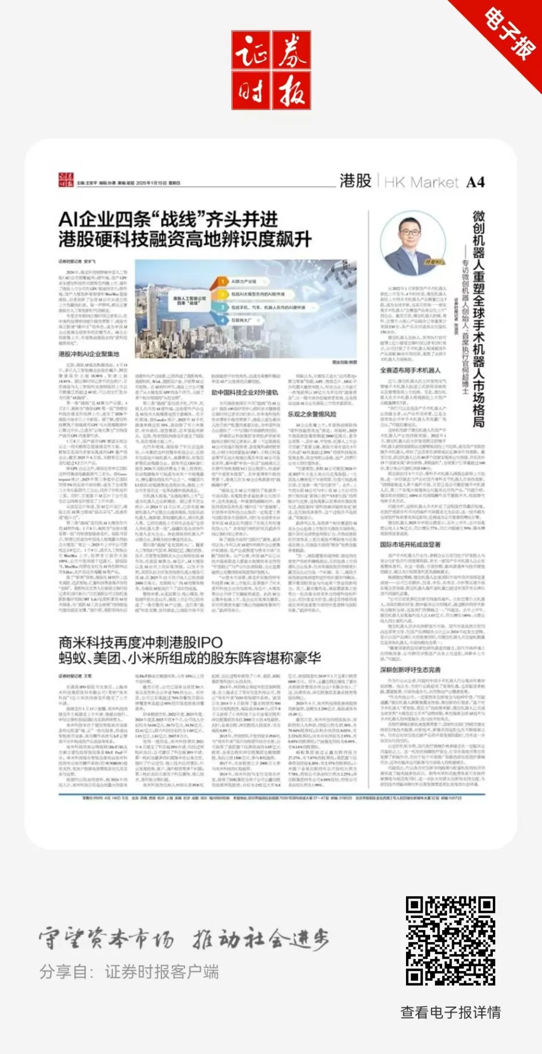 微创®机器人创始人、首席执行官何超博士近日接受证券时报记者专访时表示,公司打破了手术机器人领域被国外产品垄断20余年的局面,重塑了全球手术机器人市场格局。