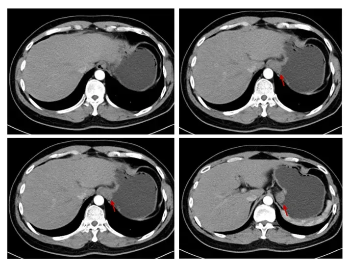 ▲术前增强CT影像:红色箭头标注为胃底近贲门后壁肿物
