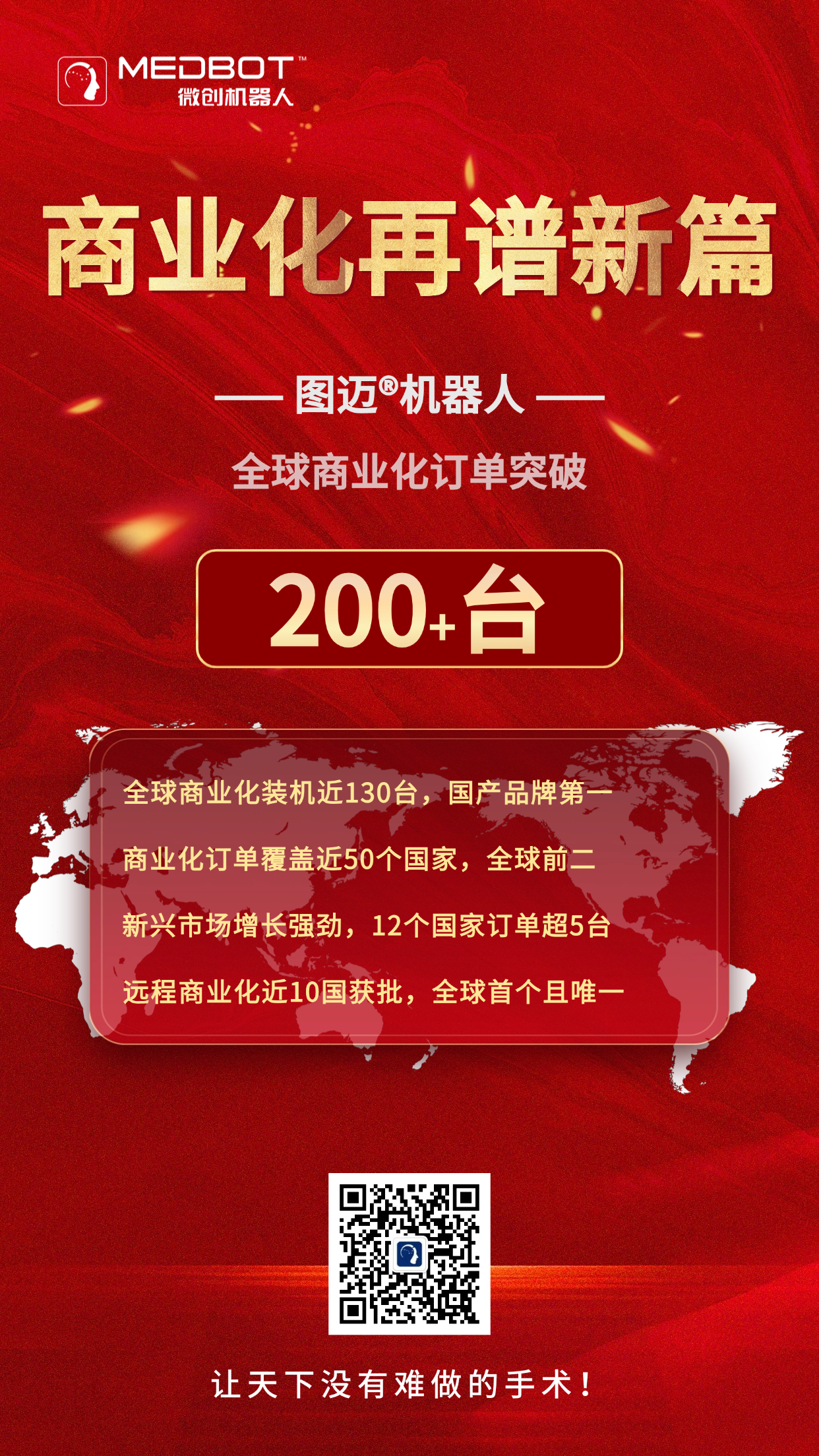 外科医生的信任,是高端手术设备最难获得、极具权威性的“价值认证”。2月11日,图迈®腔镜手术机器人全球商业化订单突破200台,覆盖近50个国家和地区,已完成商业化装机量近130台。这一里程碑不仅是图迈®机器人商业规模的再次跃升,更标志着其临床价值在全球范围内获得持续、广泛的认可——来自不同国家、不同医疗体系、不同专科背景的外科医生,正在以真实而审慎的临床决策,将图迈®纳入日常手术实践与长期学科建设之中。